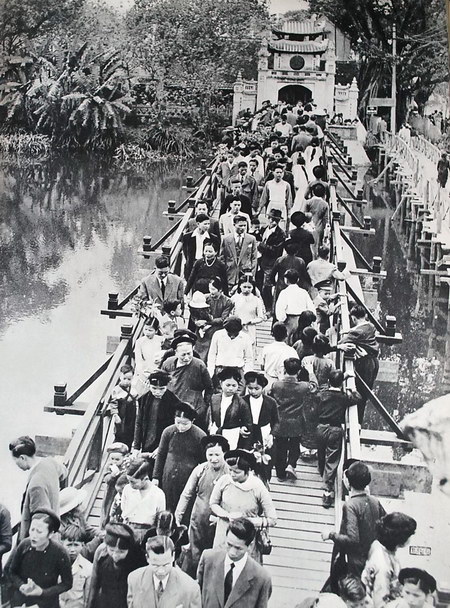 Tết năm 1952 cầu Thê Húc bị gãy. Thị trưởng Thẩm Hoàng Tín xóa sổ cầu cũ, tổ chức thi thiết kế cầu mới. Thiết kế của kỹ sư Nguyễn Ngọc Diệm được chọn. Trong quá trình xây lại cầu, họ dựng cầu tạm bên cạnh. Ảnh chụp có hai cây cầu phía trên, có lẽ là ảnh hôm khai trương cầu Thê Húc mới: vẫn còn cầu tạm, và khách đi trên cầu ăn mặc rất đẹp. Năm 1952 đang là chiến tranh Pháp Việt, nên sự kiện này hẳn là rất được gây chú ý của cư dân Hà Nội.