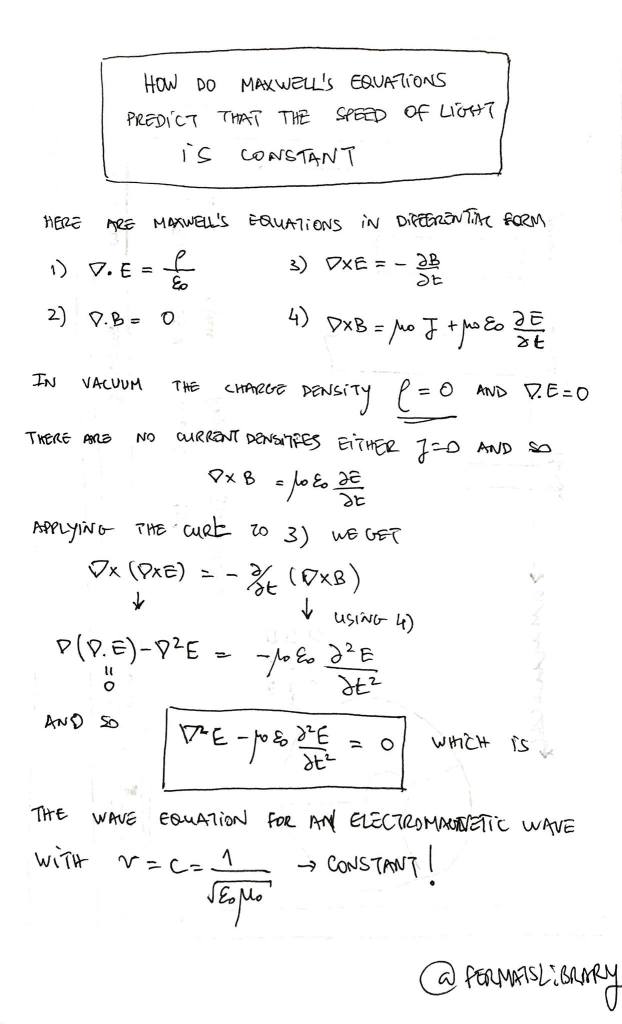 Trong hình là cách dùng hệ phương trình Maxwell để chứng chứng minh tốc độ ánh sáng là hằng số. (Nguyên thủy thì phải gọi là dùng hệ phương trình này tính toán và dự báo tốc độ ánh sáng là hằng số, sau đó thực nghiệm kiểm chứng là đúng, vì lúc đó chưa ai biết tốc độ ánh sáng là hằng số). Phép chứng minh vỏn vẹn có vài dòng. Phép chứng minh này thường được lấy ra làm ví dụ cho sức mạnh của toán học (nhưng thực ra là sức mạnh của insight vật lý).