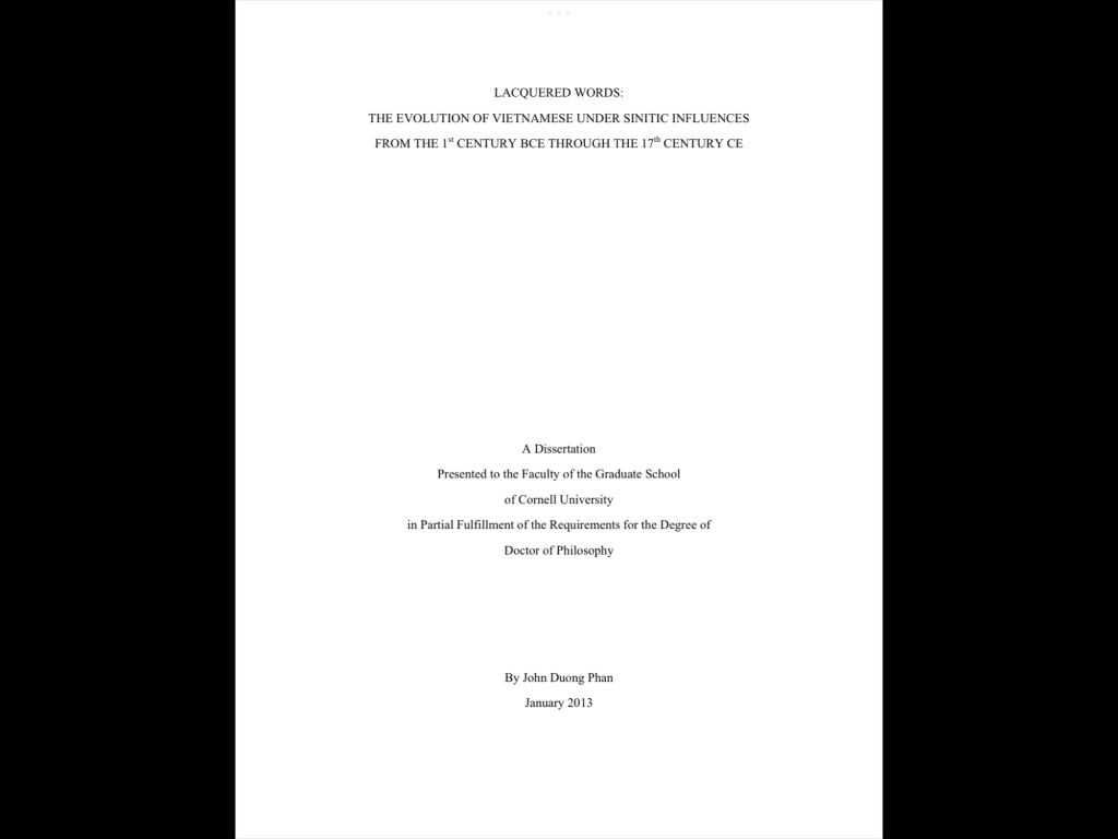 Ngoài việc sách chưa ra, thì nó cũng khá đắt mà cũng dày nữa. Trong khi John Phan lại rất đáng đọc. (Do anh này tìm ra 8 từ Hán cổ (thời Hán) và 54 từ Hán cổ (đời Tấn) xuất hiện ở Cổ Loa thời Âu Lạc và hậu Âu Lạc (old chinese du nhập vào tiếng Việt cổ, trở thành từ vựng ESV (Early Sino Vietnamese). Jonh Phan có đặt ra giả thuyết về Annamese Sino Vietanese là cái dẫn đến LSV (Late Sino Vietnanmese) là những thứ góp phần hình thành nên tiếng Việt và Hán Việt hiện đại.) Nên ta có thể tìm pdf bản luận văn của anh này năm 2013 ở DH Cornell về đọc tạm. Bản luận văn có tên: