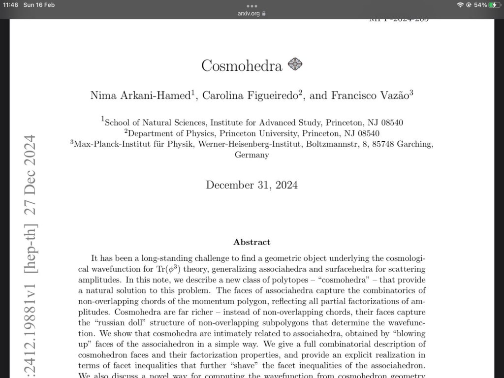 Mới đây trên arxiv xuất hiện một công trình toán vật lý có tên là Cosmohedra. Công trình này sử dụng hình học (polygon, sub-polygon…) để xác định các đối tượng hình học nền tảng (mà các tác giả gọi là cosmohedron) của hàm sóng vũ trụ (cosmological wavefunction). Nếu công trình này đúng, và đi đúng hướng, thì nó sẽ đặt nền móng cho các nhà vật lý giải được hàm sóng (lượng tử) của cả vũ trụ.