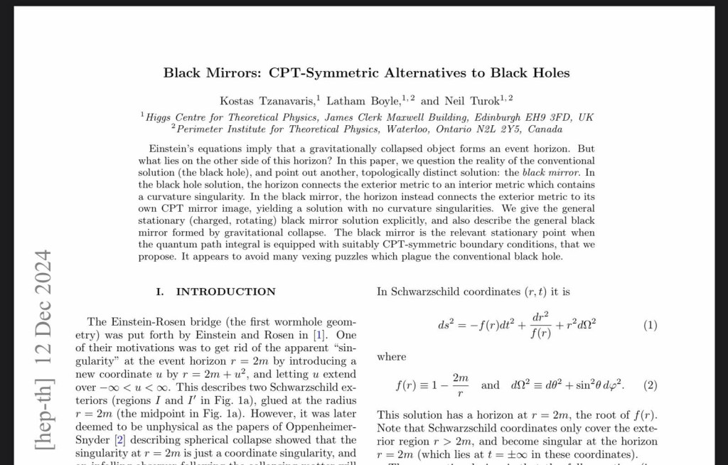 Áp dụng vào black hole thì sẽ có black mirror. Lỗ đen là một mặt phẳng, giới hạn bởi đường sự kiện. Vật chất đi vào và không thoát ra được, và theo hiểu biết cũ thì nó đi vào điểm kì dị ở vô cực. Theo thuyết mới thì hạt vật chất đi đến mặt lỗ đen như đi đến một cái gương, nhưng nó không “nhìn thấy nó” (như ta nhìn thấy ta đối xứng trong gương sáng) mà “nhìn” thấy phản hạt đi đến mặt gương từ phía bên kia. Chúng gặp nhau ở mặt gương, huỷ nhau và biến về vô cực.